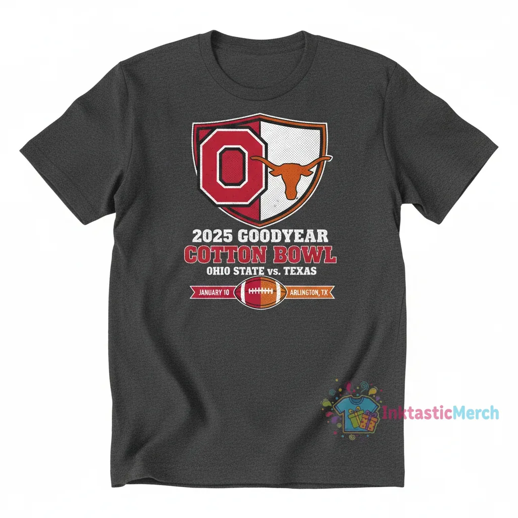 Rep the ultimate showdown with the 2025 Cotton Bowl: Buckeyes vs. Longhorns Tee. Crafted from premium, ultra-soft fabric, this shirt offers unmatched comfort and a lived-in vibe from the first wear, showcasing its quality. Discover more quality fan gear from InktasticMerch, the brand that stands for credibility and style.