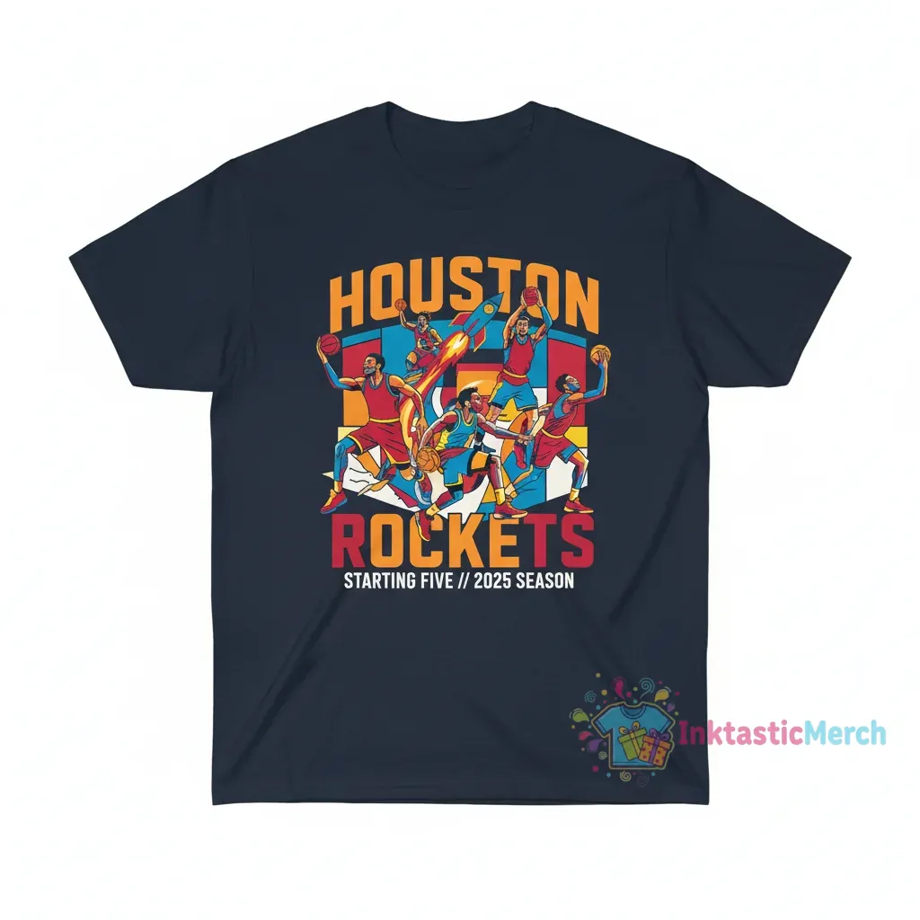 Show your Houston Rockets pride with this exclusive 2025 NBA Starting 5 graphic t-shirt from InktasticMerch. Crafted from super-soft, breathable fabric and printed with high-quality inks, this tee offers exceptional comfort and a design built to last. Represent your favorite NBA squad in style and feel the comfort while showing your passion.