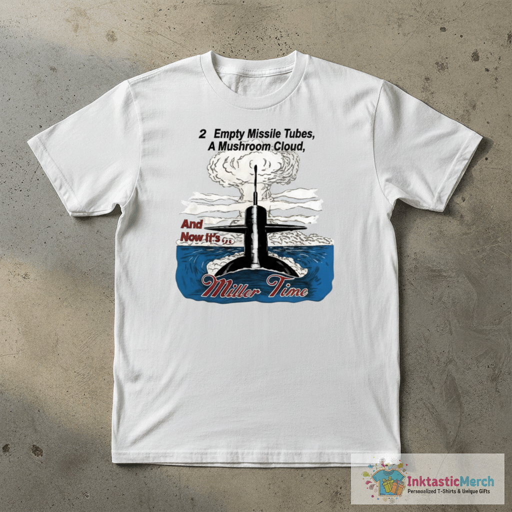 Introducing the “24 Empty Missile Tubes A Mushroom Cloud And Now It’s Miller Time Shirt” — a bold and unique statement piece that combines humor with style. Made from premium, soft cotton fabric, this T-shirt offers unmatched comfort while showcasing a lively design that is sure to spark conversations. Perfect for casual outings or relaxed days at home, it’s an easy addition to any wardrobe.