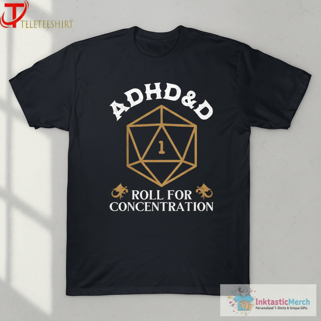 Unleash your inner adventurer with the ADHD&D Roll For Concentration DnD T-Shirt from InktasticMerch. Made from premium, ultra-soft cotton for all-day comfort and featuring a durable fabric construction, this tee is perfect for Dungeons & Dragons players and fans of geek culture. Express your love for D&D with this versatile style, ideal for gaming, conventions, or everyday wear.