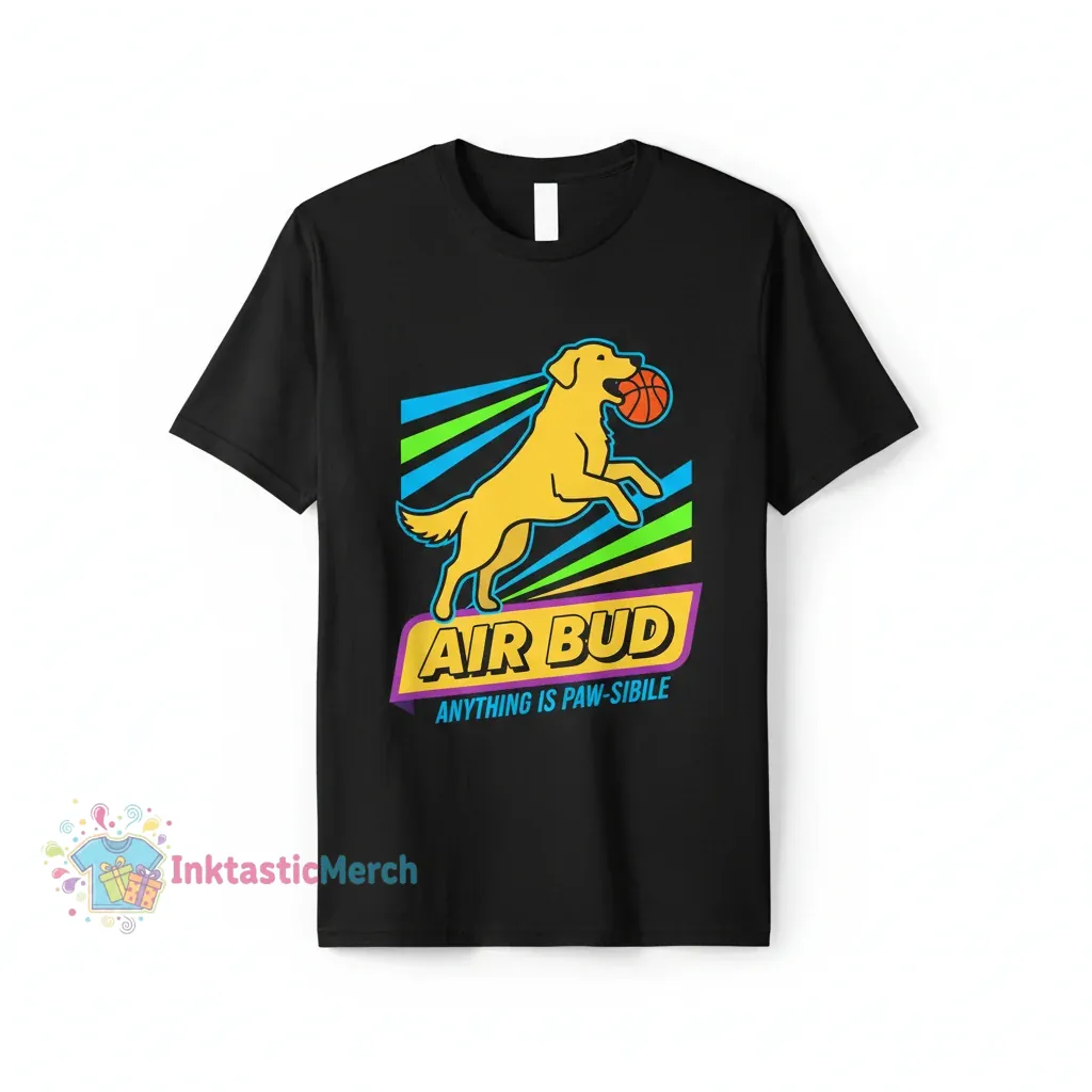 The Air Bud Inspirational T-Shirt for Men is a high-quality, heavyweight tee crafted from 100% ring-spun cotton, offering exceptional comfort and lasting wear. Inspired by the beloved franchise, this durable shirt features a modern retail fit and is available in classic black, size small, from inktasticmerch.com.