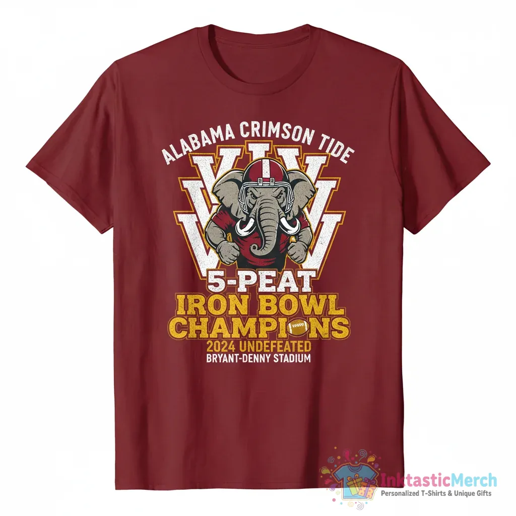 Celebrate a historic achievement with the Alabama Crimson Tide 2024 5-Peat Iron Bowl Champions shirt! This exclusive tee commemorates the Crimson Tide’s incredible five consecutive Iron Bowl victories, a true testament to their dominance, and is designed for true fans by inktasticmerch.com. It’s incredibly comfortable, soft, and built to last, ensuring you can celebrate every win in style for years to come.