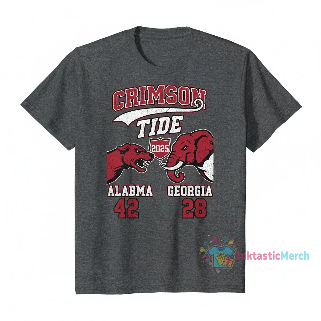 Show your team spirit with the Alabama Crimson Tide vs Georgia Bulldogs 2025 Score T-Shirt, the ultimate fan apparel for any college football enthusiast. This shirt captures the excitement of a legendary matchup, celebrating the anticipated 2025 game between these two powerhouse teams. It’s more than just a shirt; it’s a statement of your unwavering support and passion for your favorite team, perfect for reliving the game or looking forward to the next epic showdown.