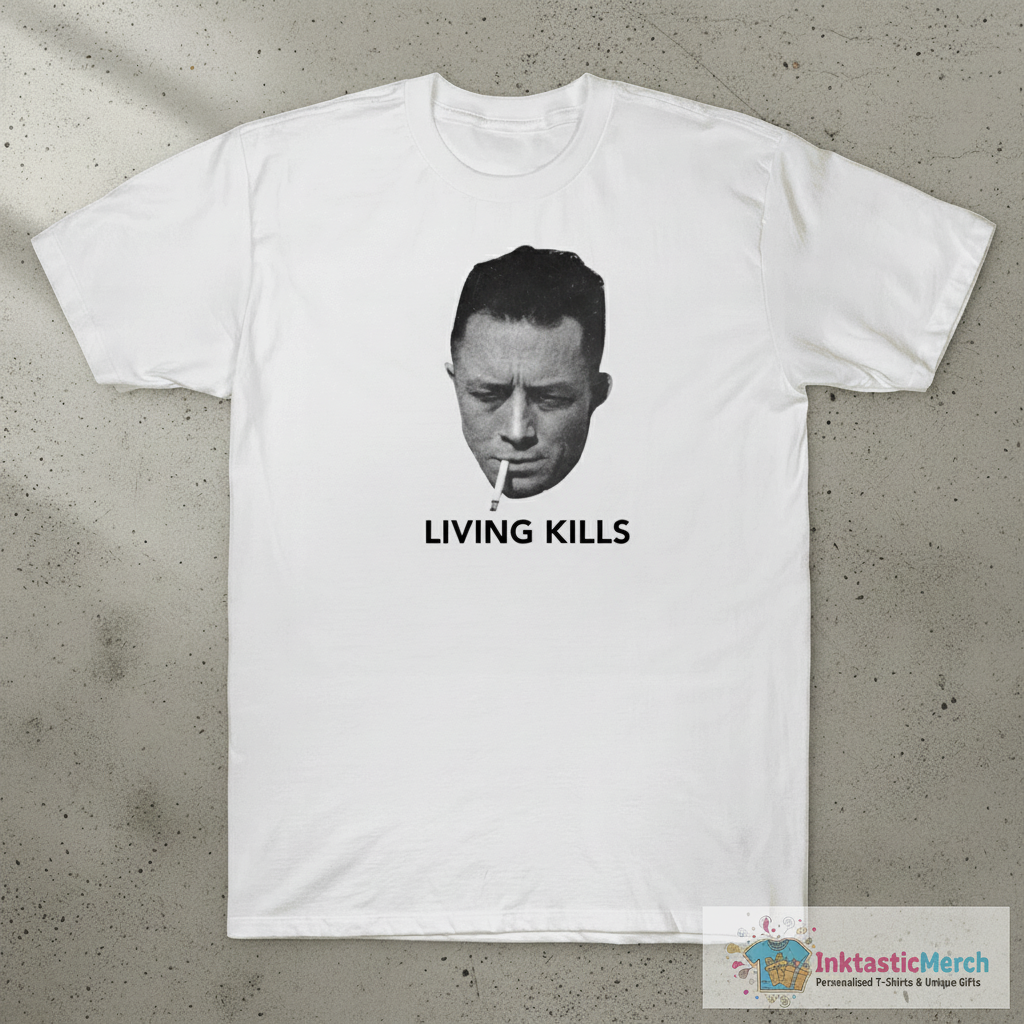 Bring your style to life with the Albert Camus Living Kills Mug T-Shirt today!