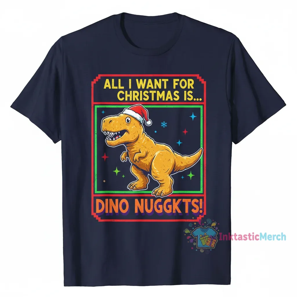 Embrace the season with the modern aesthetic of the “All I Want For Christmas Dino Nuggets Ugly Sweater” from InktasticMerch. Crafted from a premium, ultra-soft fabric blend, this sweater offers unparalleled comfort and a luxurious feel, making it a staple in your winter rotation. Its generously soft material and durable construction ensure lasting wear for an effortlessly cool, conversation-starting design.