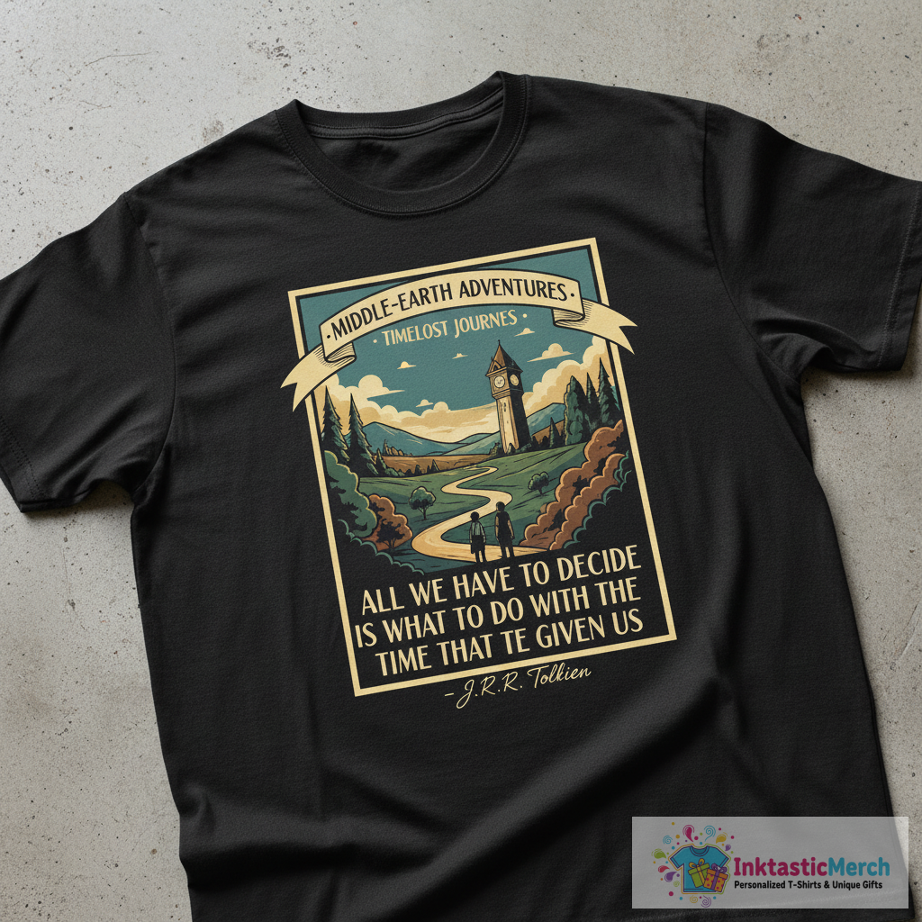 Immerse yourself in the profound world of J.R.R. Tolkien with our “All We Have to Decide” LOTR T-Shirt. Drawing inspiration from the legendary Lord of the Rings series, this t-shirt features one of Tolkien’s most memorable quotes. It’s perfect for fans eager to display their love for Middle-Earth and its timeless wisdom.