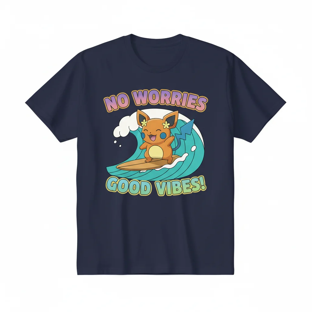 Bring your style to life with the Alolan Raichu Surfing T-Shirt – No Worries, Good Vibes! today!