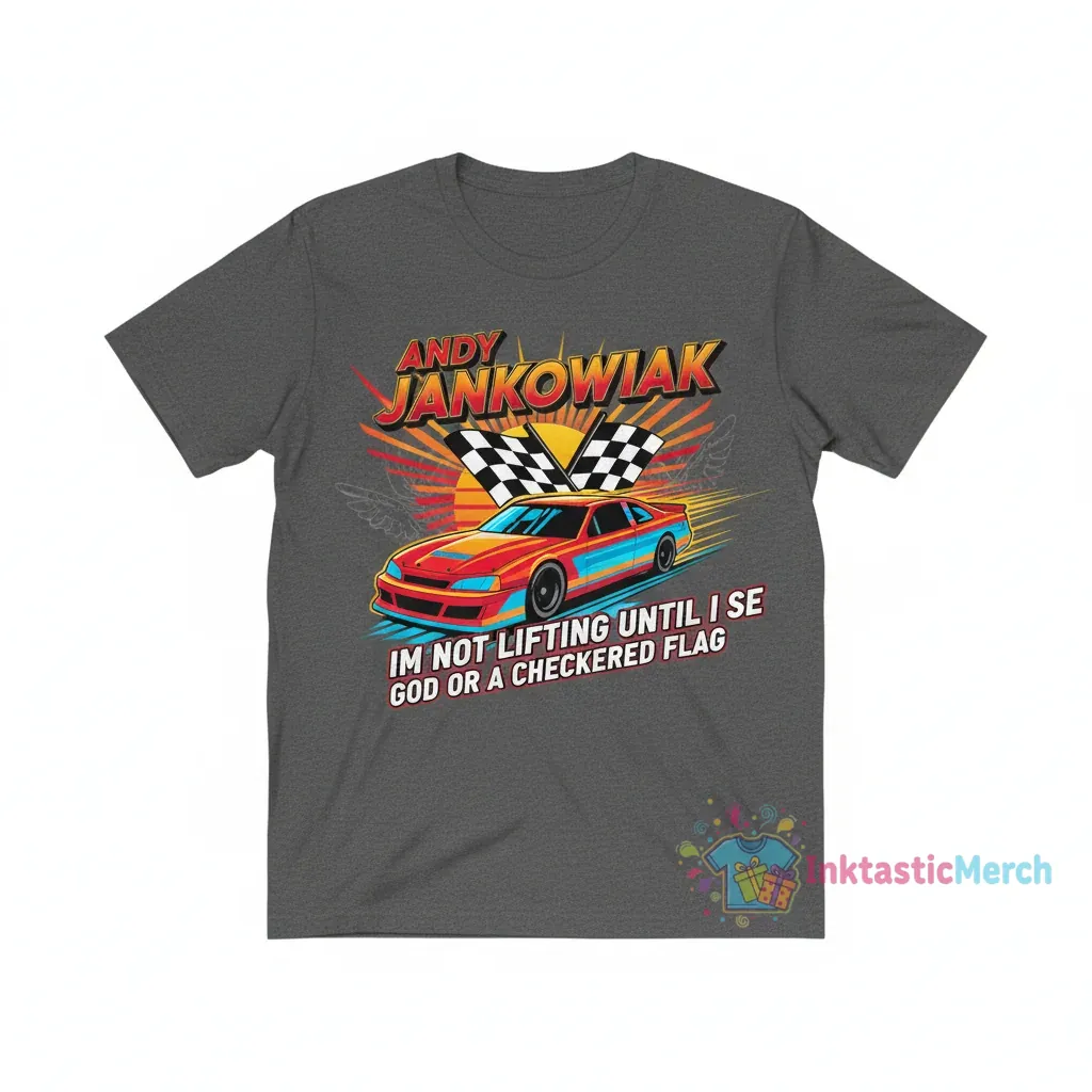 Show off your unique sense of humor and passion for racing with the Andy Jankowiak “I’m Not Lifting Until I See God Or A Checkered Flag” T-Shirt. This tee is perfect for anyone who understands the dedication it takes to hit the gym or the track, designed for ultimate comfort and everyday wear. Discover more from InktasticMerch, where high-quality fabric meets a relatable message for anyone with a driven spirit.