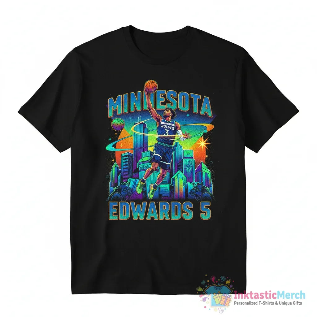 Show your love for Anthony Edwards and the Minnesota Timberwolves with this unique skyline cartoon T-shirt from InktasticMerch. Made from top-notch fabric, this ultra-soft tee is designed for all-day wear, blending cool art with your passion for the game. Its high-quality print and durable construction ensure you can represent your favorite player and team in style, wash after wash.