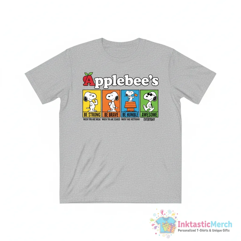 This shirt is ideal for Snoopy fans, Applebees enthusiasts, and anyone who loves motivational apparel. It makes a fantastic gift for friends and family who embody strength and positivity. Wear it to casual gatherings, movie nights, or simply as a daily reminder to stay strong, be brave, be humble, and be awesome. It’s also perfect for themed events or showing off your playful side.