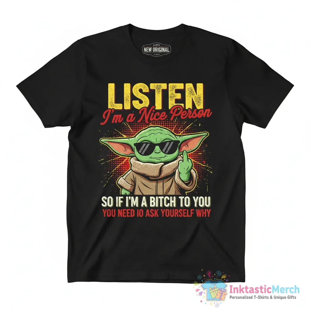 Bring your style to life with the Baby Yoda middle finger listen I’m a nice person so if I’m a bitch to you shirt today!