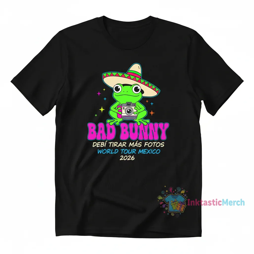 Show your love for Bad Bunny and his iconic ‘Debí Tirar Más Fotos’ World Tour Mexico 2026 with this exclusive Frog T-shirt. This high-quality tee is designed for ultimate comfort and style, making it a must-have for any dedicated fan. Celebrate the unforgettable moments and electrifying performances of the tour with apparel that captures the spirit of the event. Perfect for concerts, casual outings, or as a collectible item, this shirt is a fantastic way to commemorate Bad Bunny’s groundbreaking tour in Mexico.