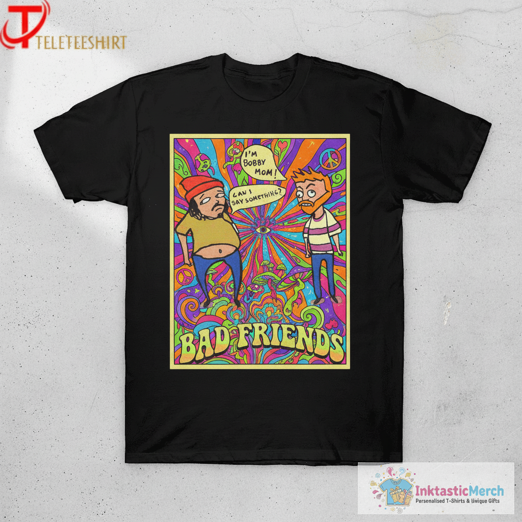 Show off your unique sense of humor with the “Bad Friends Iu2019m Bobby Mom Cau I Say Something T-shirts”! Crafted from super-soft, high-quality cotton, this tee feels amazing and features a durable print designed to last. Explore more conversation-starting pieces at inktasticmerch.com.