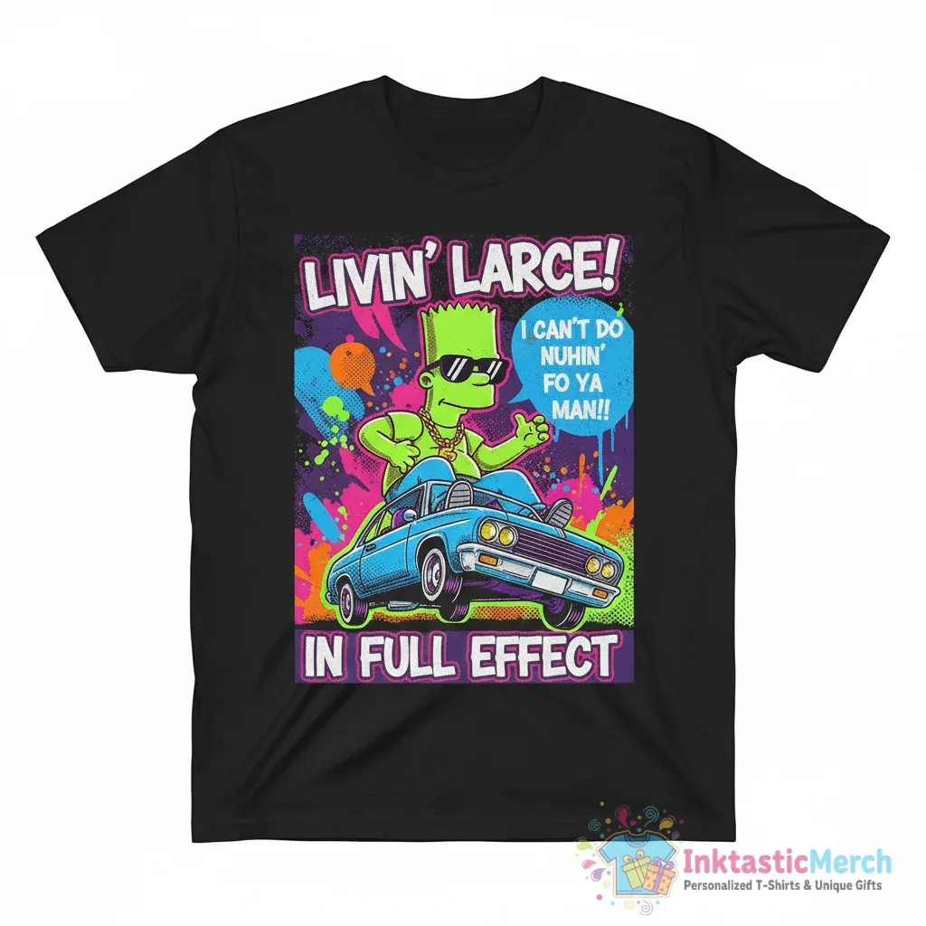 Show off your rebellious side with the Bart Simpson Bootleg Livin’ Larce shirt, crafted from ultra-soft premium fabric for maximum comfort and designed to stand out. This statement piece captures the iconic energy of Bart Simpson’s attitude, perfect for any fan who loves a bit of mischief and iconic cartoon style. Discover more quality apparel and express your personality at inktasticmerch.com.
