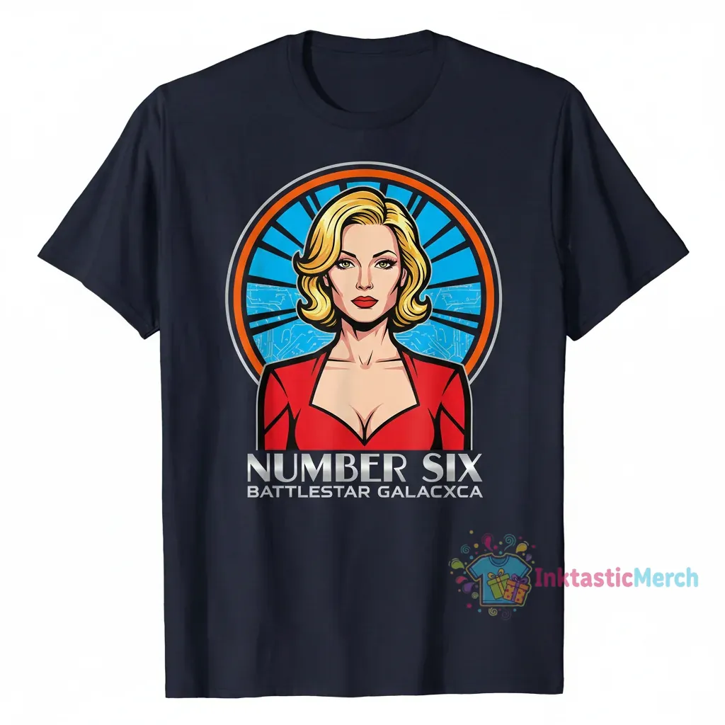 Immerse yourself in the captivating aura of Number Six with this expertly rendered portrait. The artwork channels the character’s complex nature, blending vulnerability with an undeniable strength. Each line and shadow is carefully crafted to evoke the mystery and depth that made her a fan favorite. This design isn’t just a picture; it’s a statement, a tribute to a character who embodies resilience and intrigue. Feel the power of the artwork as it brings a piece of the Battlestar Galactica universe to your everyday wardrobe, allowing you to subtly express your appreciation for sophisticated storytelling and compelling characters.