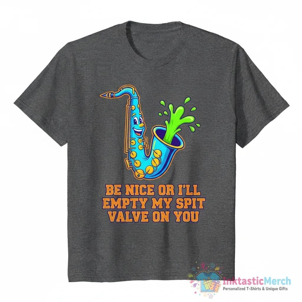 - Unique “Be Nice Or I’ll Empty My Spit Valve On You Saxophone” graphic design.