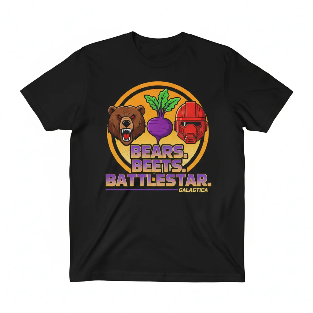 From casual Fridays to weekend marathons of your favorite show, this t-shirt is your new go-to. Its durable construction and timeless design make it versatile enough for any event. Don’t just wear a quote—wear a piece of quality apparel that represents your fandom flawlessly. Ready to own the best fan shirt you’ll ever find? Add the ‘Bears, Beets, Battlestar Galactica’ T-shirt to your cart now and experience the difference.