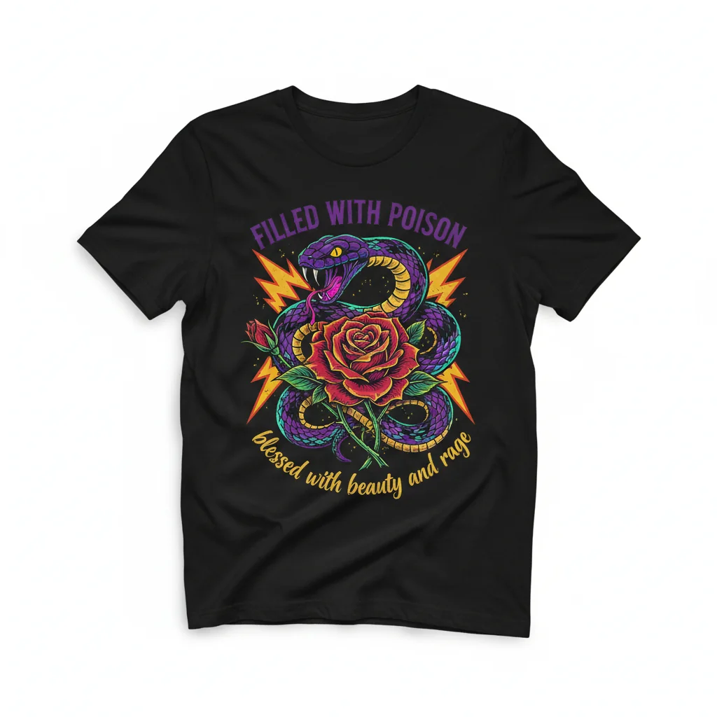 Filled with poison but blessed with beauty and rage, this isn’t just a t-shirt; it’s a wearable declaration of strength, a canvas for the complex magic within you. It’s for those who embrace every facet of their being – the fierce, the captivating, and the beautifully untamed. Slip into this tee and feel the power of your own story unfold, ready to conquer your day with grace and an undeniable edge.