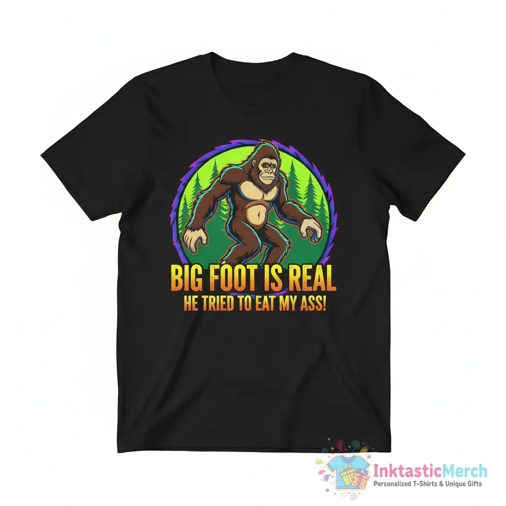 - Unique and funny “Big Foot is real he tried to eat my ass” graphic design.