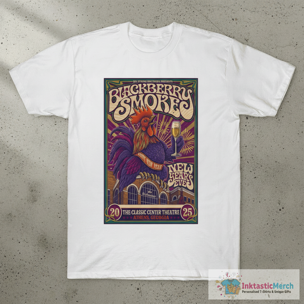 Show off your love for Blackberry Smoke and their iconic New Year’s Eve show with the official Blackberry Smoke The Classic Center NYE Tour Athens, Georgia 2025 Happy New Years Rooster T-shirt, crafted from a premium cotton blend for incredible softness and comfort. This tee features a unique rooster design printed with high-quality inks that last, embodying the band’s classic rock vibe and the spirit of the celebration. Discover more fan-favorite merchandise at inktasticmerch.com.