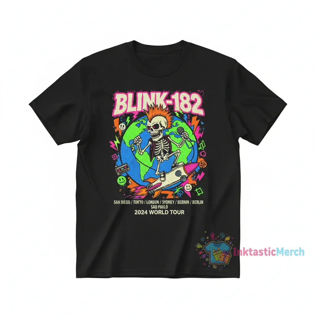 Elevate your everyday style with a t-shirt that’s as meaningful as it is comfortable. The classic black color provides a versatile canvas for the unique graphic, making it easy to pair with jeans, shorts, or your favorite jacket. This Blink Vintage 182 World Tour shirt is more than just apparel; it’s a statement of your passion and a nod to timeless musical journeys. Add this essential piece to your collection and embrace a look that’s both iconic and effortlessly cool.