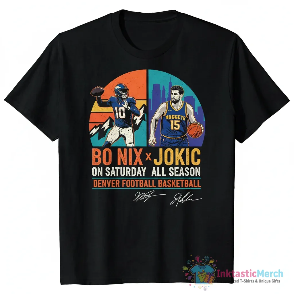 Show your ultimate fan pride with the Bo Nix Denver Broncos X Jokic Denver Nuggets All Season Signatures shirt! This unique tee celebrates two Denver powerhouses, merging the excitement of Broncos football with the championship spirit of the Nuggets. It’s the perfect way to represent your favorite teams all year round, whether you’re cheering from the stands, watching with friends, or just out and about. This shirt isn’t just apparel; it’s a statement of your Denver dedication.