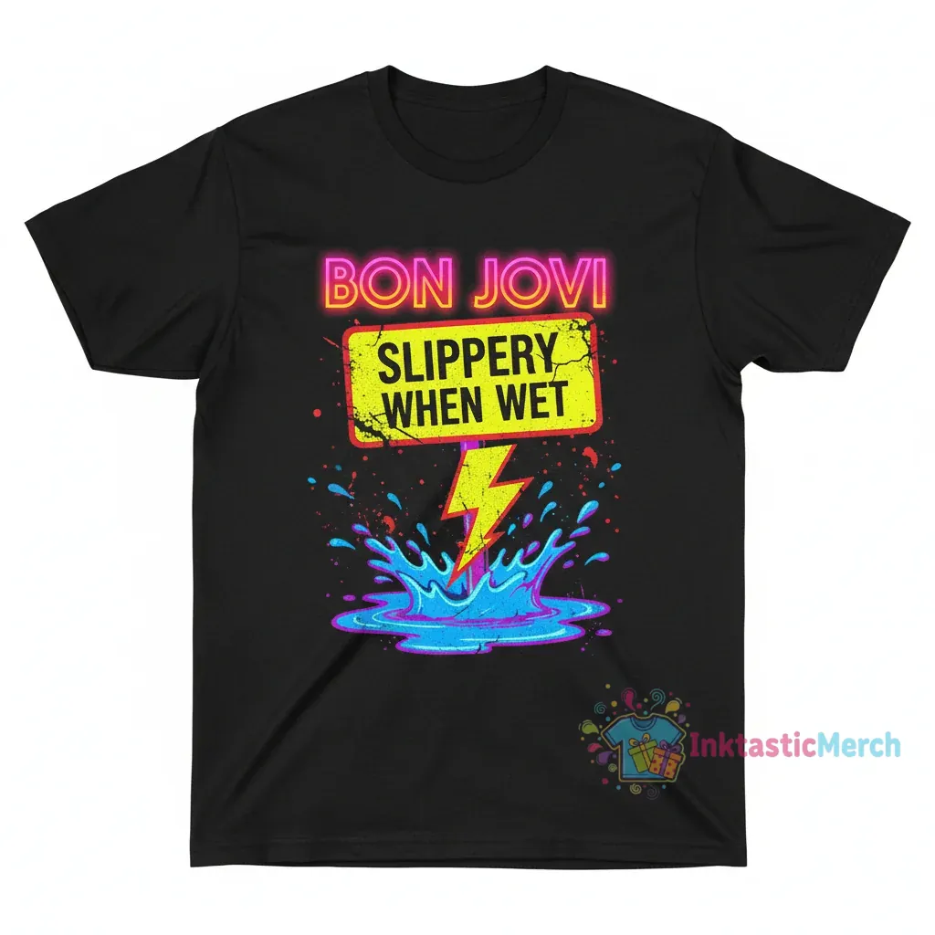 Show your love for the iconic rock band Bon Jovi with this classic ‘Slippery When Wet’ T-shirt, a must-have for any dedicated fan. Crafted from 100% ring-spun cotton, this high-quality tee offers exceptional softness and breathability, ensuring a comfortable fit for concerts or casual wear, and you can discover more at inktasticmerch.com.