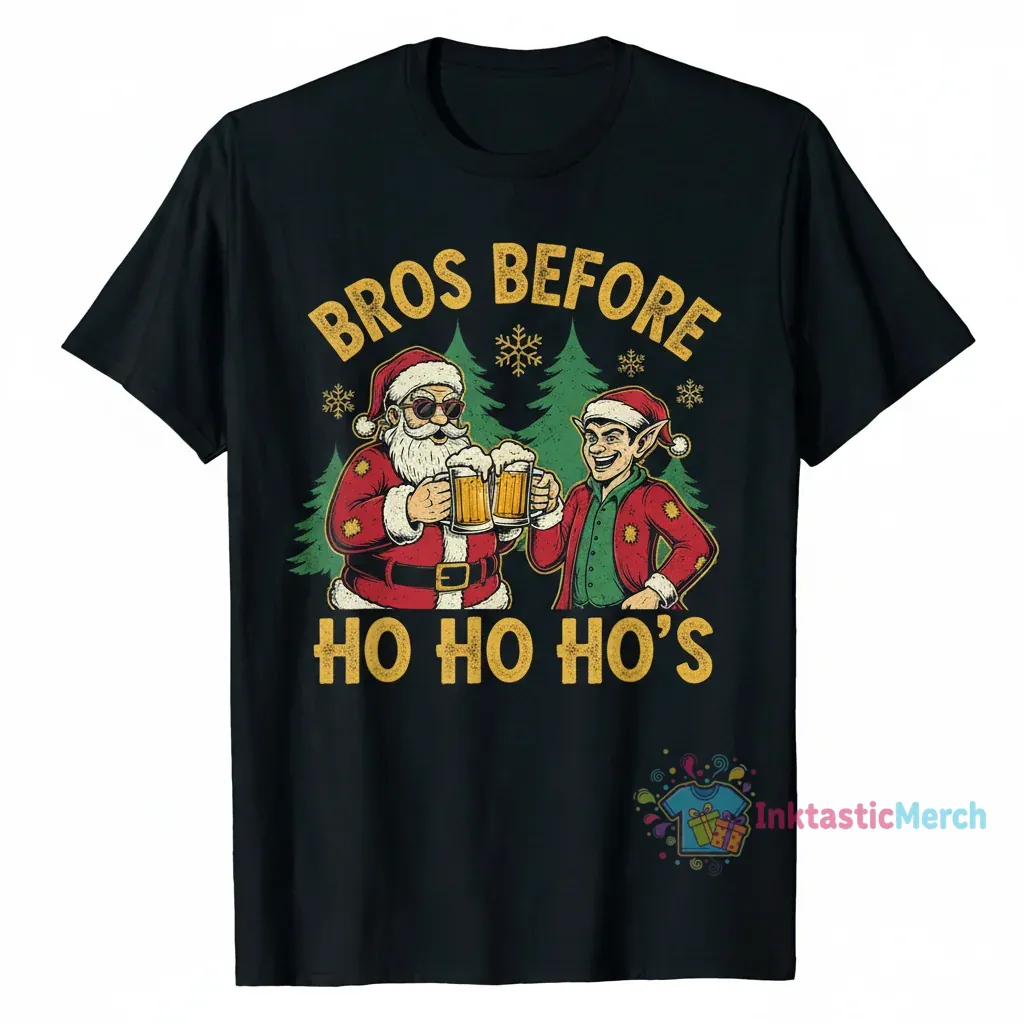 Embrace the modern festive spirit with the “Bros Before Ho Ho Ho’s: Santa & Elf Beer Crew Tee” from InktasticMerch. This tee blends iconic holiday characters with a contemporary edge, offering an attitude that’s effortless cool meets holiday cheer. Crafted from premium, ultra-soft fabric, it provides next-level comfort and a high-end feel, making it a statement piece for any occasion.