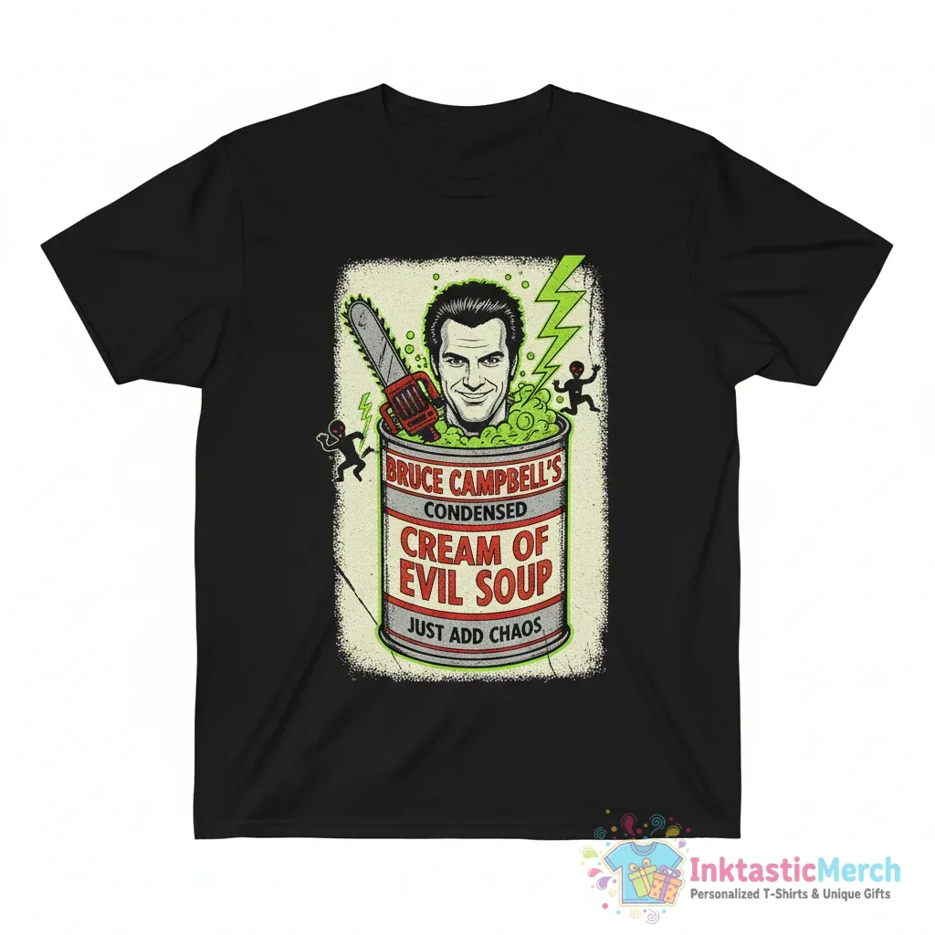 Show your appreciation for the legendary Bruce Campbell with this uniquely designed “Condensed Cream of Evil Soup” T-shirt from InktasticMerch. Crafted from a premium, ultra-soft cotton blend, this tee offers superior comfort and lasting durability, ensuring it remains a favorite for years to come. Its classic unisex fit provides a relaxed style perfect for any fan of cult classics, horror comedies, or simply those who love a comfortable, distinctive shirt.