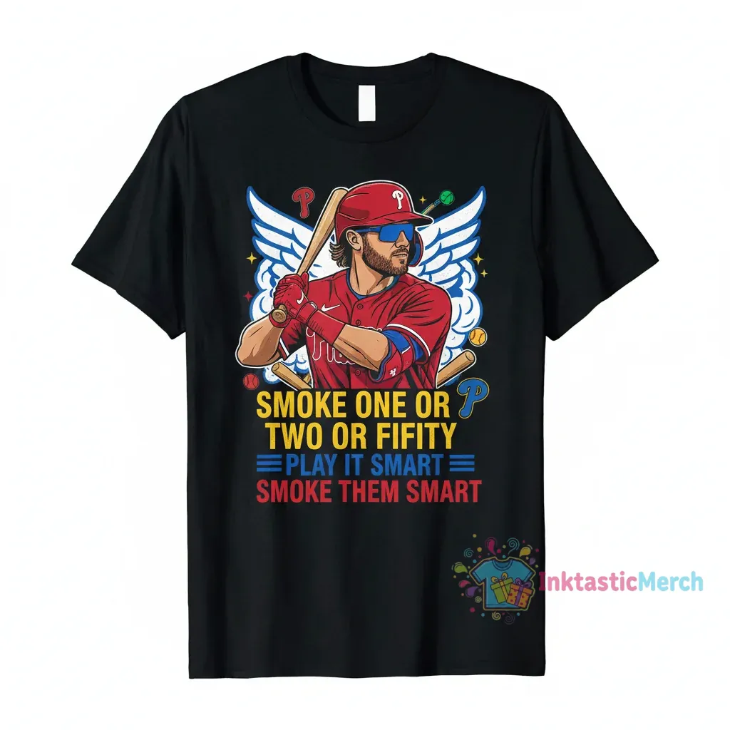 Embrace the spirit of a champion with the Bryce Harper Smoke Smart Phillies Tee, crafted from premium, ultra-soft fabric for unmatched comfort and a luxurious feel. This tee, inspired by Bryce Harper’s game and featuring a high-definition graphic of iconic Phillies moments, is more than just a shirt—it’s a statement of winning energy, brought to you by InktasticMerch. Experience next-level softness and durable construction designed for effortless style and all-day coolness.
