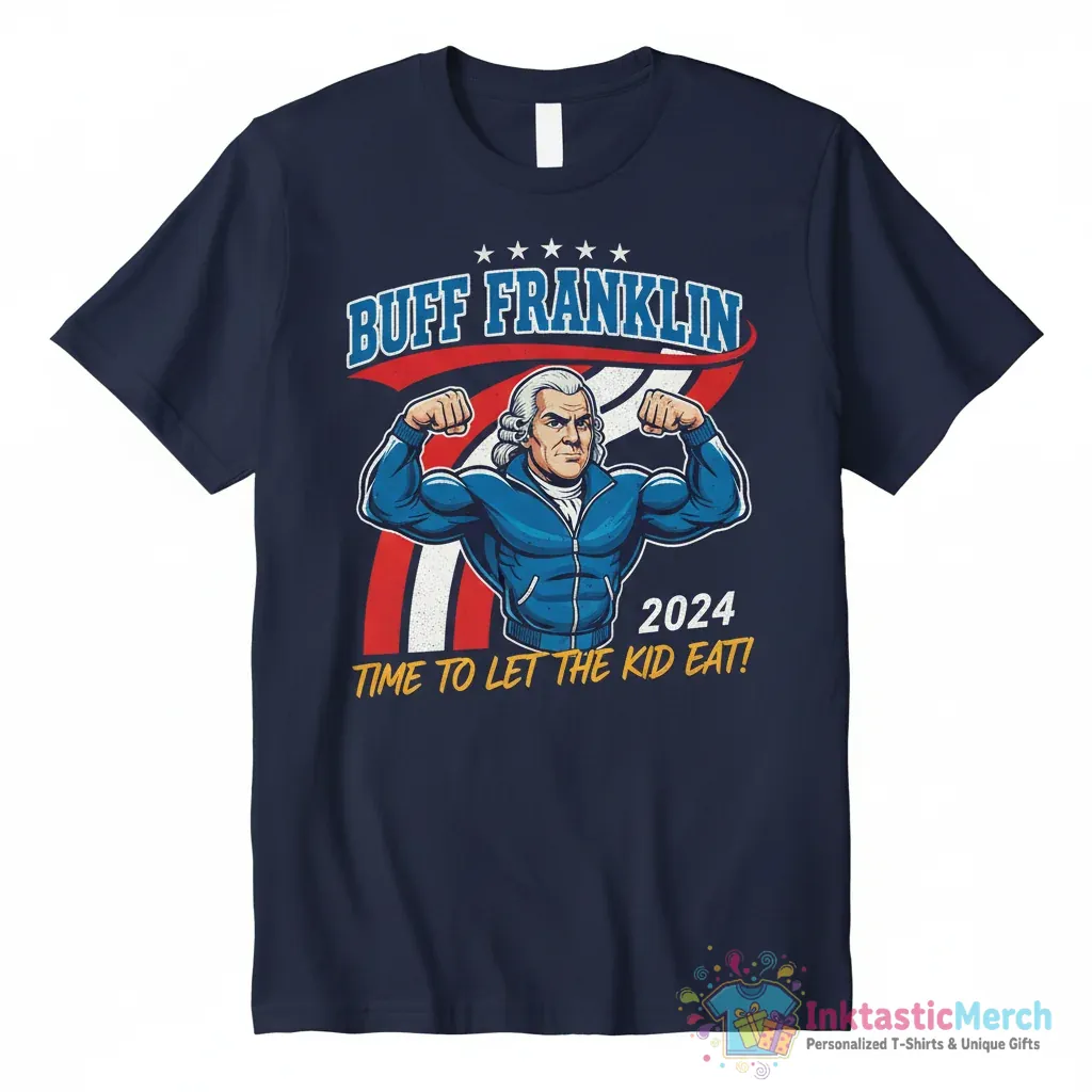 Show your support for a unique political statement with the Buff Franklin 2024 Time to Let the Kid Eat Shirt from InktasticMerch. This tee offers the perfect blend of comfort and style, crafted from high-quality, ultra-soft fabric for superior comfort that’s ideal for all-day wear. The eye-catching design is printed with durable inks that are made to last, ensuring your message gets across with a smile.