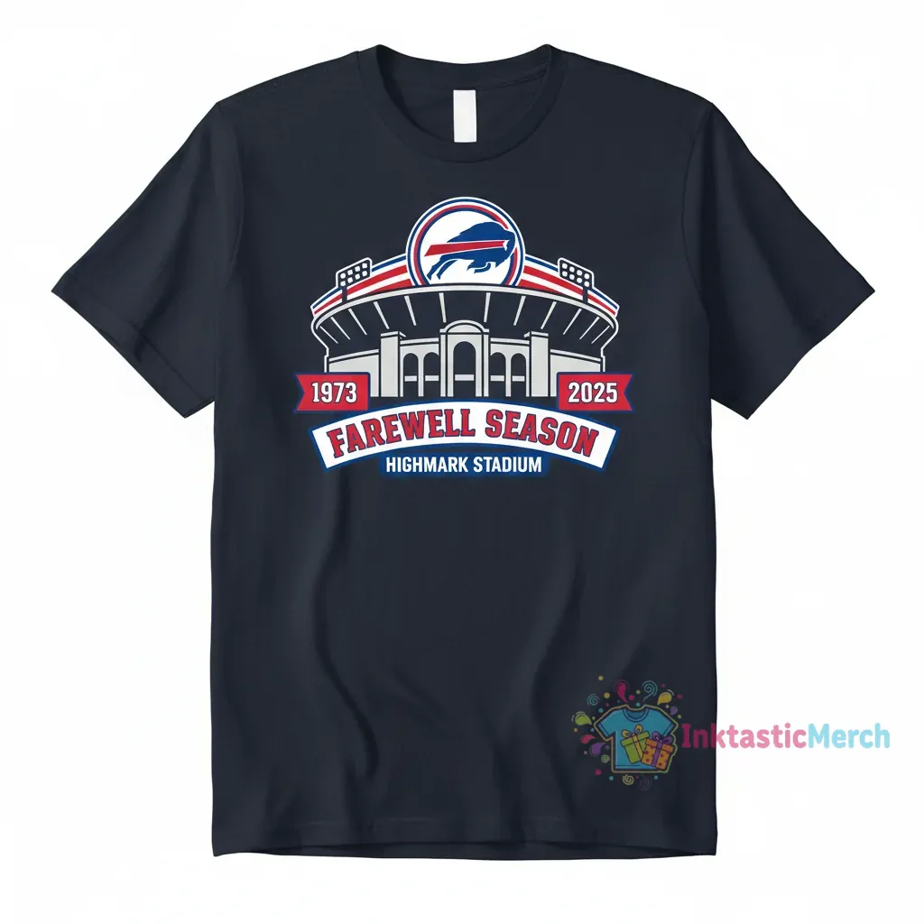 Celebrate the Buffalo Bills’ Farewell Season at Highmark Stadium (1973-2025) with this must-have t-shirt, a piece of team history you can wear proudly. Crafted from ultra-soft, premium fabric, this durable tee offers maximum comfort and a classic unisex fit, making it a treasured part of your fan gear from InktasticMerch.