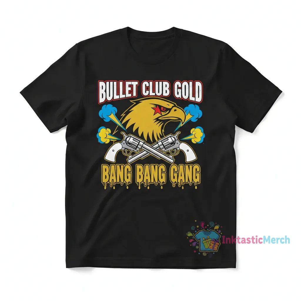 Bullet Club Gold Bang Bang Gang shirt. This isn’t just a shirt; it’s a statement born from the electrifying energy of rebellion and the iconic swagger of a legendary faction. We’ve captured that raw, undeniable spirit in a design that speaks to the bold, the brave, and the ones who dare to walk their own path. It’s for the fans who understand the legacy, the moments, and the feeling of being part of something bigger. This original artwork is more than just ink on fabric; it’s a piece of history, reimagined for today’s revolutionaries.