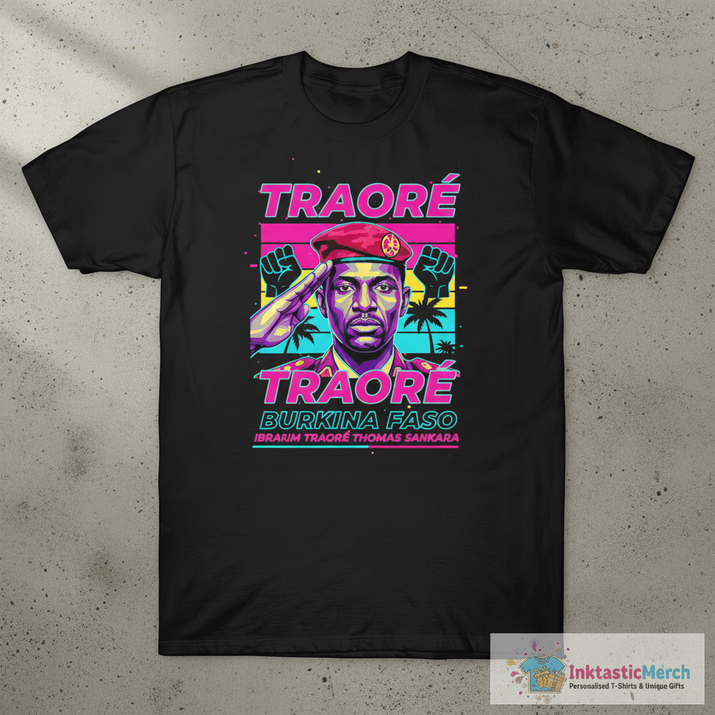 Show your support with the Burkina Faso Ibrahim Traoré Thomas Sankara T-Shirts from inktasticmerch.com. This tee is more than just clothing; it’s a statement of pride and solidarity, designed for comfort and style with a powerful graphic celebrating the spirit of Burkina Faso. You’ll love the soft feel and eye-catching design, made from high-quality fabric for everyday wear and a meaningful addition to any collection.