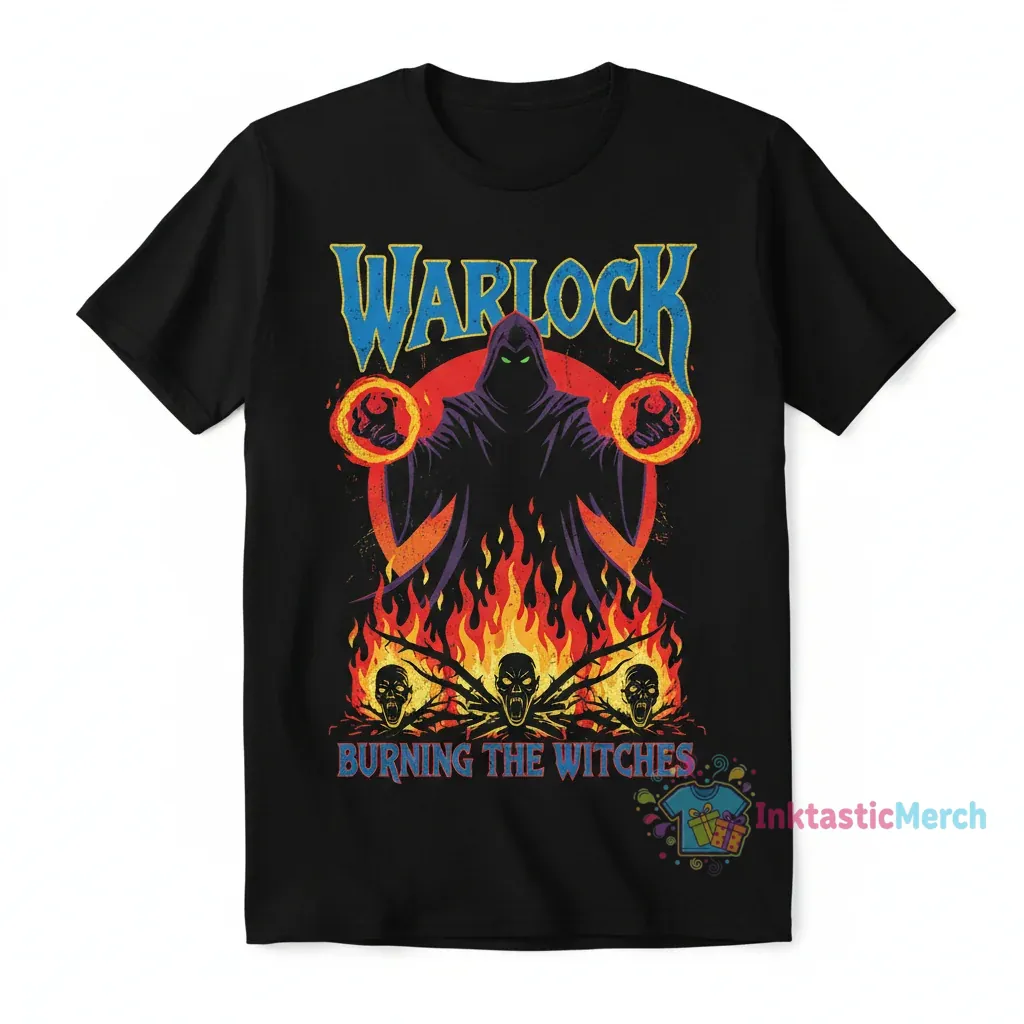 Show your love for iconic metal with this awesome Burning the Witches Metal Warlock band t-shirt from inktasticmerch.com. This tee is designed for true fans who appreciate great music and a cool look, offering a unique band design and super soft comfort that feels as good as it looks.
