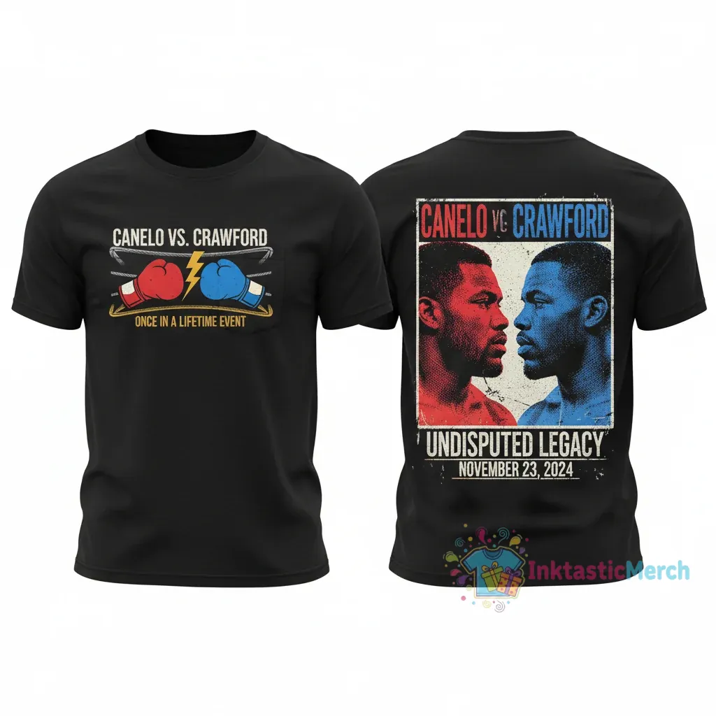 Make a statement with the Canelo vs Crawford: Once-In-A-Lifetime Event 2-Sided T-Shirt from InktasticMerch. Crafted from 100% premium pre-shrunk cotton with vibrant, eco-friendly inks, this shirt offers unparalleled comfort and durability, ensuring you celebrate this epic boxing showdown in style for years to come.
