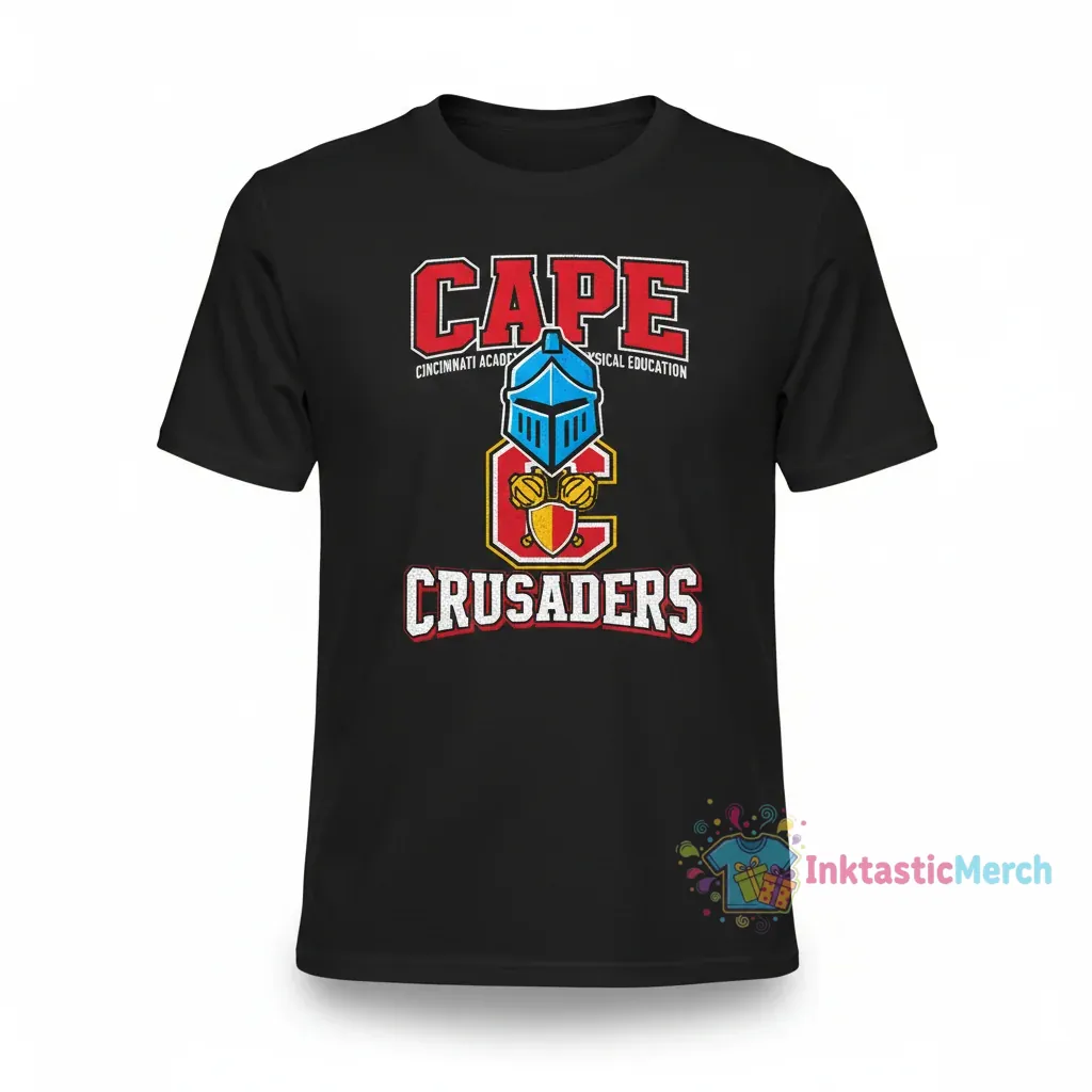 Showcase your pride for the Cincinnati Academy of Physical Education with the CAPE Crusaders T-Shirt, meticulously crafted from 100% ring-spun cotton for exceptional softness and breathability. Designed for lasting wear, this tee features a comfortable retail fit and durable construction reinforced with shoulder-to-shoulder taping. Represent your connection to CAPE in style and comfort, available at inktasticmerch.com.