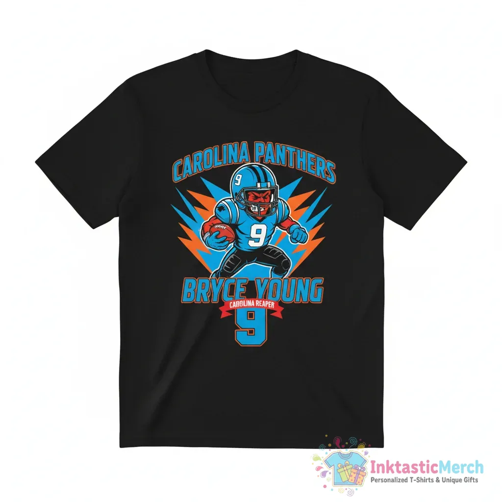 Show your team spirit with the ultimate Carolina Panthers Bryce Young Carolina Reaper 9 shirt from InktasticMerch. Made with high-quality, incredibly soft fabric, this tee offers premium comfort for all-day wear while showcasing a vibrant design that celebrates your passion for the Panthers and Bryce Young’s electrifying energy. Its classic unisex fit ensures it looks great on everyone, making it a versatile addition to any fan’s wardrobe.