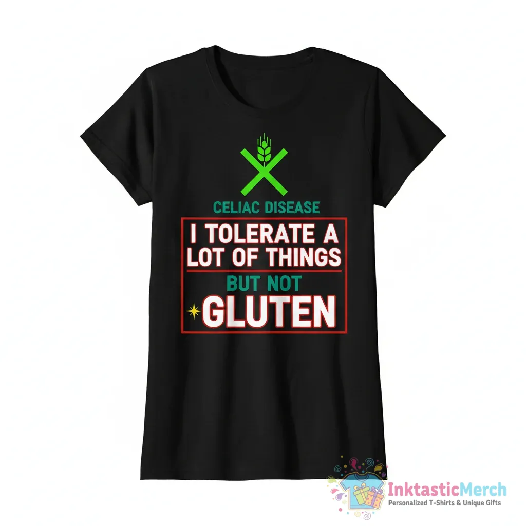 Show off your sense of humor and your dietary journey with the “Celiac Disease I Tolerate a Lot of Things but Not Gluten” T-shirt from inktasticmerch.com. Made with premium quality materials, this tee feels as good as it looks, offering a lighthearted way to communicate your needs and celebrate resilience with a good laugh.