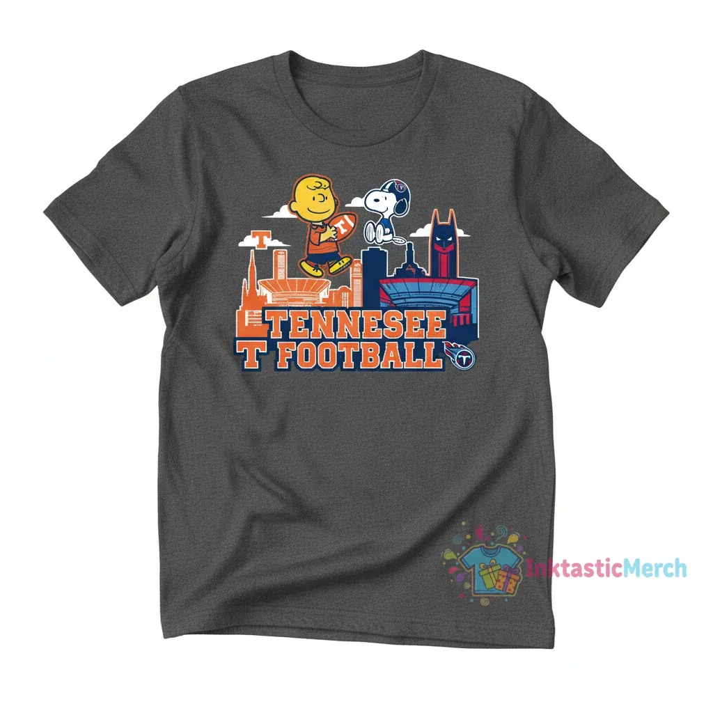Show your Tennessee pride with this unique Charlie Brown and Snoopy Tennessee Vols x Titans Skyline t-shirt, perfect for any fan. Crafted for exceptional comfort and longevity, this t-shirt is made from 100% ring-spun cotton, ensuring a soft feel against your skin while offering superior durability. Discover more designs at inktasticmerch.com.
