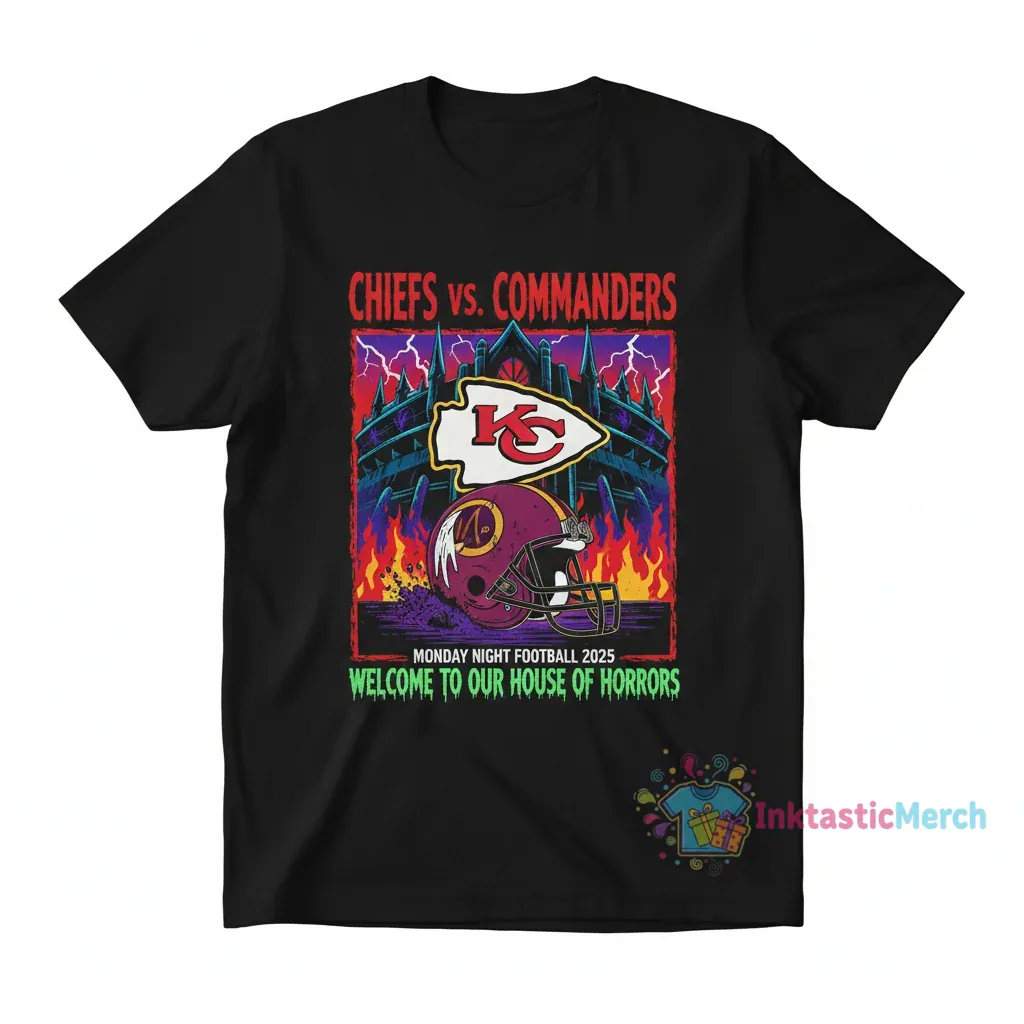 Step into the vibe with the Chiefs vs Commanders ‘House of Horrors’ tee, designed for those who move with intention and capture the electric energy of Monday Night Football with a distinctly modern, street-ready edge. Crafted from a premium, ultra-soft cotton blend, this tee feels as good as it looks, offering breathable comfort all day long. Discover more modern aesthetics and explore our exciting collection at inktasticmerch.com.