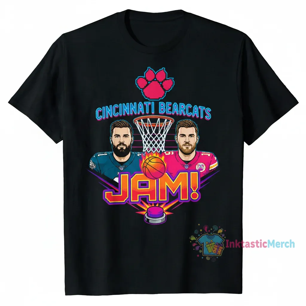 Fans of the Cincinnati Bearcats, supporters of Jason Kelce and Travis Kelce, football enthusiasts, college alumni, casual wear, game days, tailgating, and gifting to fellow sports lovers. Bring your style to life with the Cincinnati Bearcats Jam Jason Kelce & Travis Kelce Fan T-Shirt today!