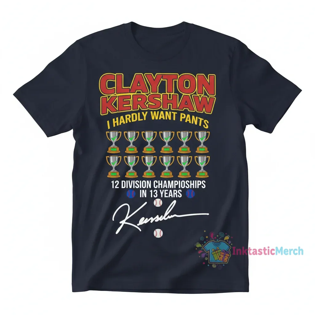 Celebrate Clayton Kershaw’s exceptional career with this ‘I Hardly Want Pants’ 12 Division Championship Signature Shirt from InktasticMerch. Crafted from a buttery soft, breathable blend, this shirt offers unparalleled comfort and a relaxed, unisex fit, embodying the triumphant spirit and sheer joy of monumental achievements. It’s more than just a graphic; it’s a wearable celebration of resilience and pushing boundaries.