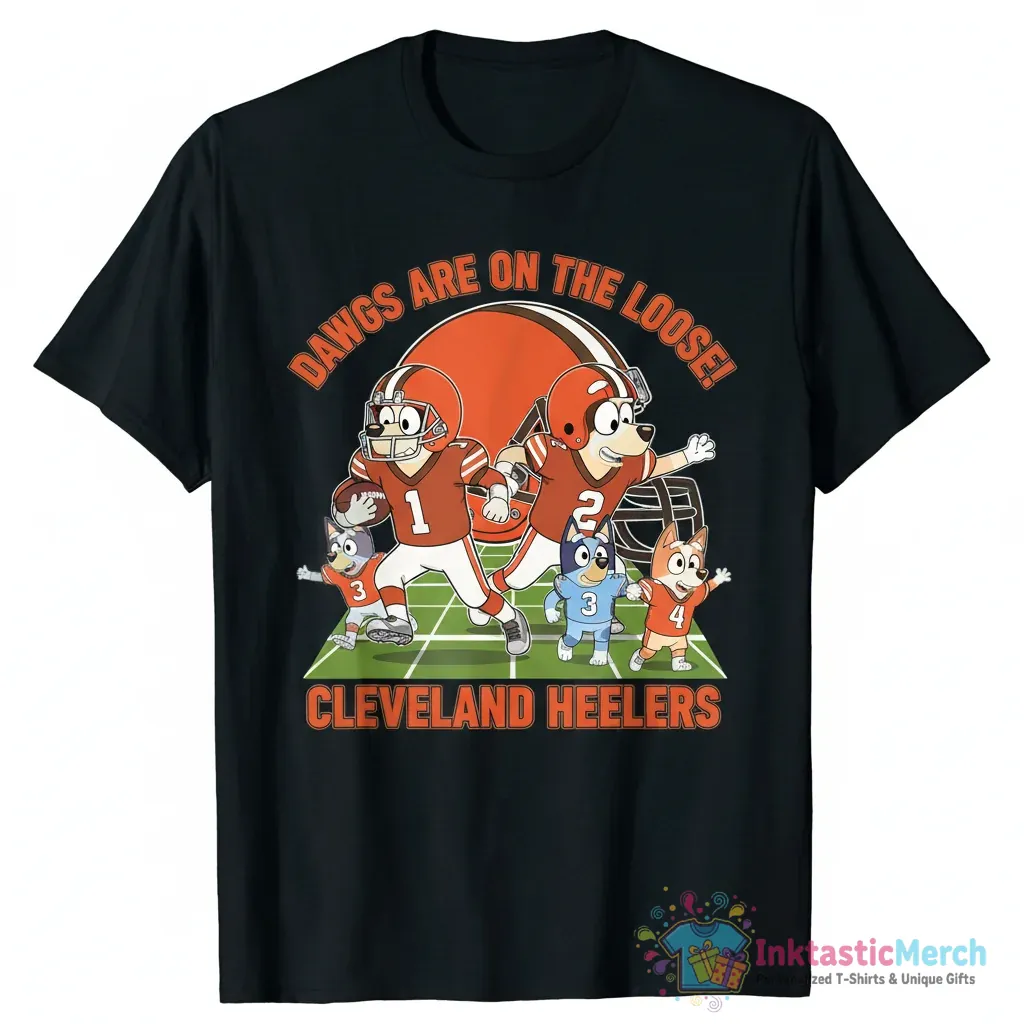 Show your love for the Cleveland Browns and the beloved Bluey characters with this unique and comfortable T-shirt! Featuring Bandit, Chilli, and Aunt Trixie Heeler, this shirt is perfect for any fan who enjoys both NFL action and animated fun. Crafted from premium quality fabric, it offers a soft feel and lasting wear, making it a go-to choice for everyday adventures. Whether you’re cheering from the stands or relaxing at home, this tee brings together your favorite worlds in one stylish package.