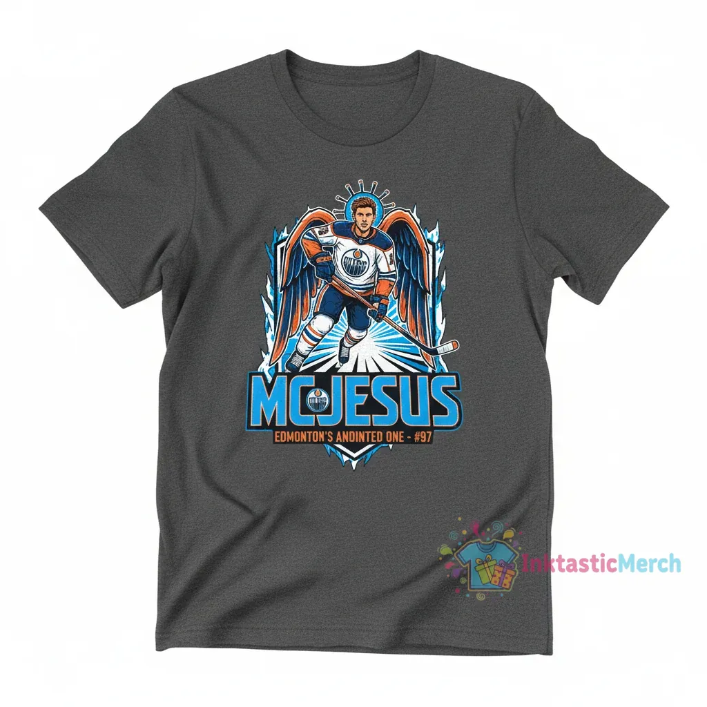 Connor McDavid’s legendary talent on the ice has inspired more than just cheers. Our “McJesus” graphic tee captures the electrifying spirit of this Oilers icon, a symbol of dedication, skill, and the sheer joy of the game. This original artwork isn’t just a shirt; it’s a tribute to the moments that make us leap to our feet, a wearable piece of hockey history that celebrates the passion of the Edmonton Oilers faithful. It’s designed for fans who understand the magic of #97 and want to carry that inspiration with them.