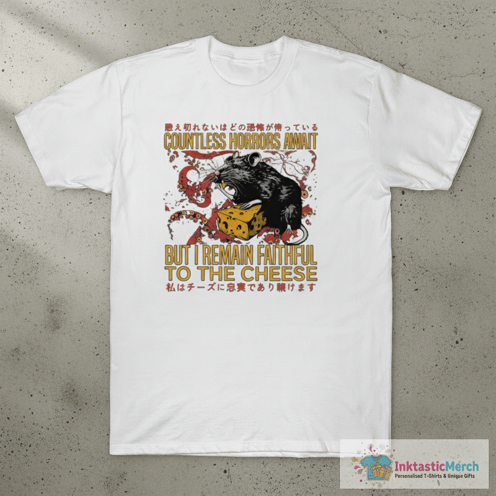 - Unique “Countless Horrors Await But I Remain Faithful To The Cheese” graphic design.