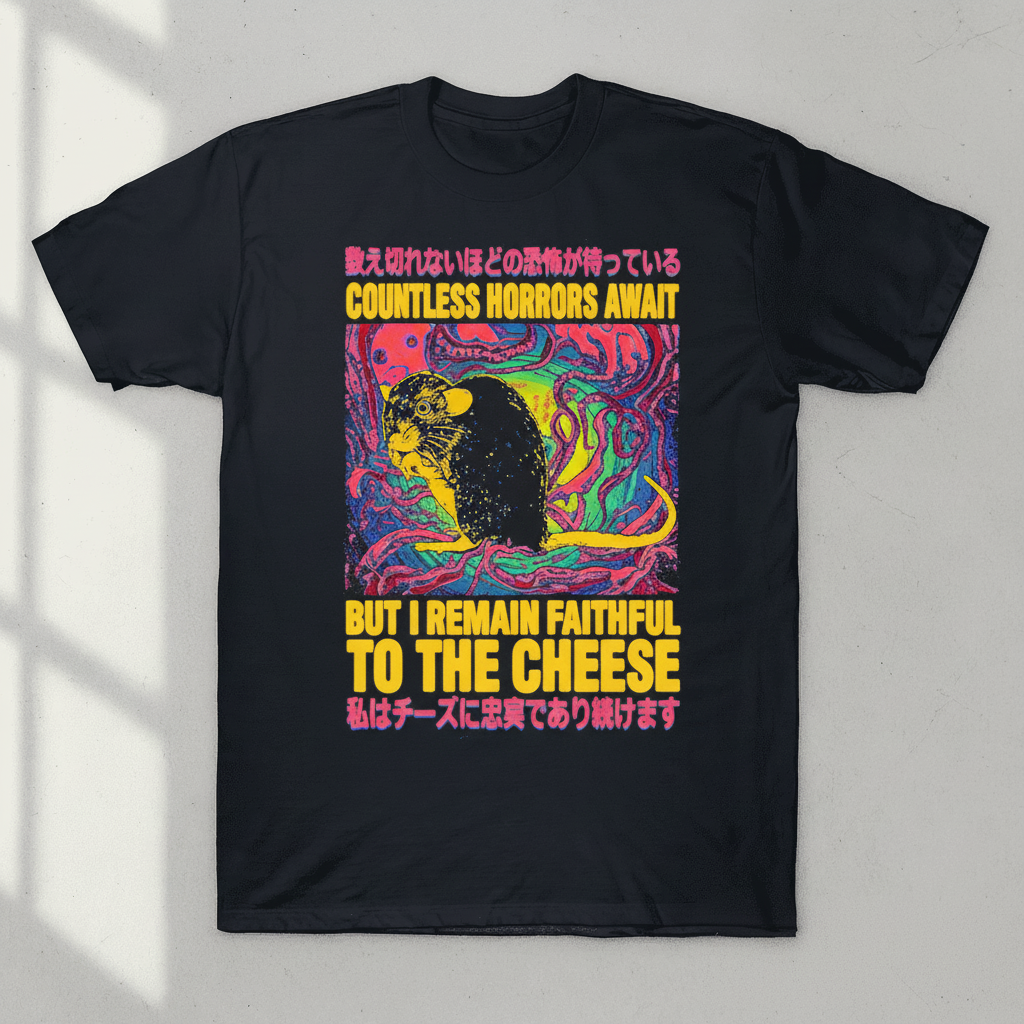 - Eye-Catching Design: Features the hilarious “Countless Horrors Await But I Remain Faithful To The Cheese” slogan.