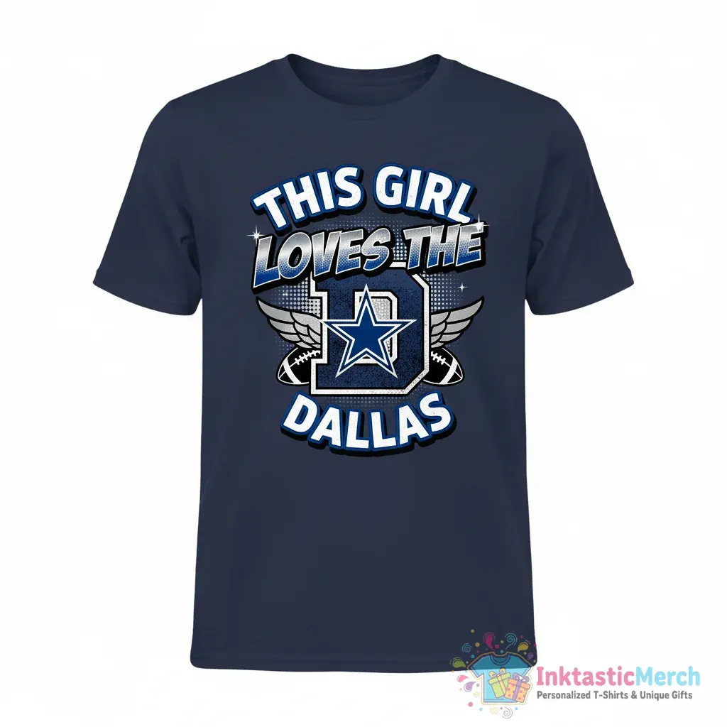 Show your love for America’s Team with the “Dallas Cowboys Football This Girl Loves the D” T-shirt, a must-have for any dedicated fan featuring unique team-inspired graphics. Crafted from incredibly soft, high-quality fabric, this tee offers premium comfort and durability, making it a versatile addition to any fan’s wardrobe. Express your passion for Dallas Cowboys football in style and comfort by visiting inktasticmerch.com.