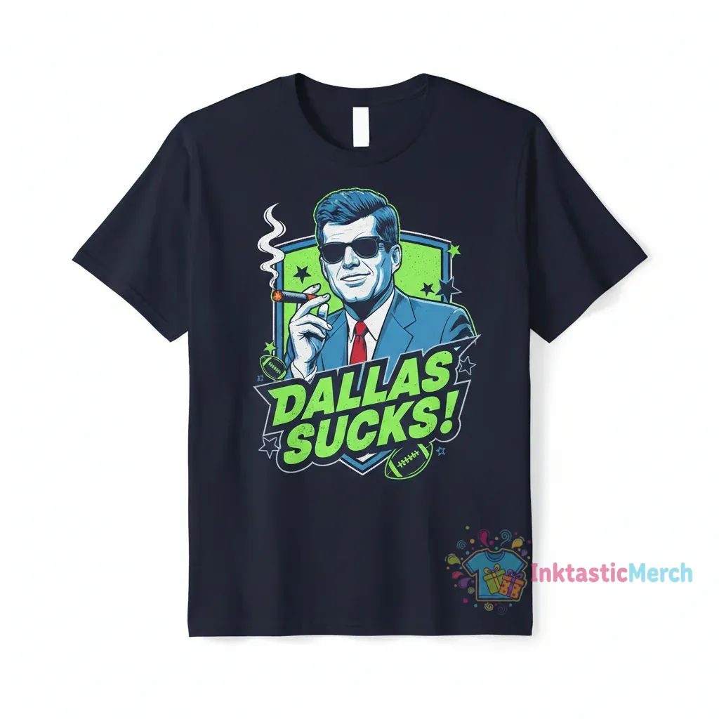 Make a statement that resonates with the Dallas Cowboys Suck JFK Smoking Cigar T-Shirt. This isn’t just a shirt; it’s a conversation starter, a bold declaration of your loyalties, and a testament to iconic, rebellious imagery. Forget blending in – this tee is designed for those who aren’t afraid to stand out and express their unique perspective with a touch of historical swagger. Embrace a look that’s both iconic and provocative.