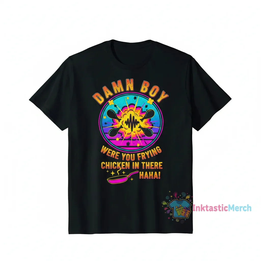Celebrate joy-filled moments with our ‘Damn Boy, Frying Chicken? Haha Shirt,’ a unique celebration of laughter and happiness captured through original artwork. Crafted for premium comfort with 100% breathable cotton, this tee is designed to be your go-to essential, embodying a cool, effortless lifestyle vibe, and can be found at inktasticmerch.com.